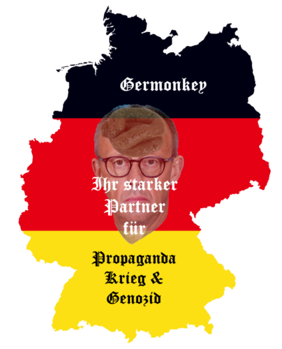 Die beiden größten Friedensmissionsregime des 21. Jahrhunderts, Uncle Sambia und Zionististan, besinnen sich mal wieder auf ihre Kernkompetenz: Propaganda, Krieg, Zerstörung, Massenmord – solange der Vorrat reicht. Begeisterung über dieses weltpsychologisch wertvolle Engagement herrscht bei ihrem Kult-Lakaien Germonkey, dessen Chef-Koloskop „Deep Fritz“1 sein maul- und klauenseuchiges Endstadium-Grinsen mit der passenden Duftnote „Merde pour Homme“ umschmeichelt. Sein erstes Statement bei der Bundeswahrheitskonferenz nach seinem Intim-Besuch beim gesicherten endfriedensnobelpreiswürdigen Donald dem Größten: